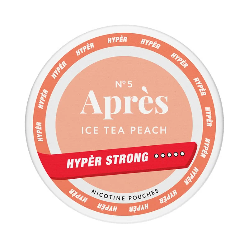 No.5 Après Ice Tea Peach Hypèr Strong pouches incorporate the flavours of ice tea and peach. This slim format is categorized as Extra Strong and includes 20 pouches per can.